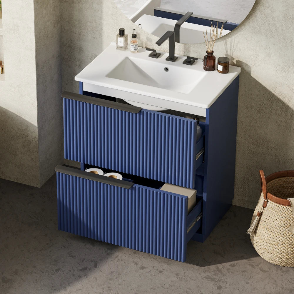 Experience timeless bathroom elegance with the QIZHIKUAJING freestanding vanity, featuring a pristine ceramic sink, integrated countertop, and whisper-smooth soft-close drawers that elevate everyday routine to luxury.