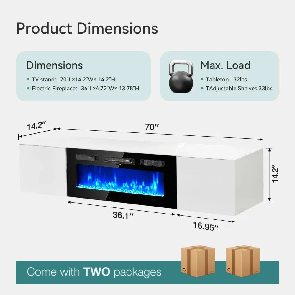 - Floating, space-saving design lets you mount TVs up to 78" while featuring a mirrored 36" fireplace insert and a 68" gloss cabinet to create a contemporary focal point in your room.