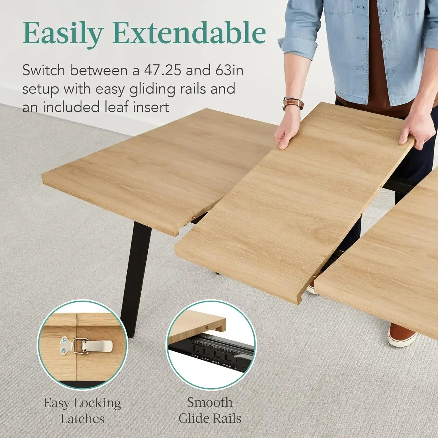 - Easily extendable with smooth gliding rails: pull the sides and insert the leaf to switch between 47.25" and 63" long, expanding seating for up to six.