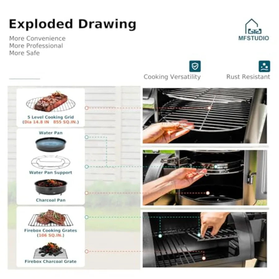 - You get 5 removable chrome-plated racks that offer 855 sq in of smoking space to fit ribs, brisket, pork shoulder, and everyday cuts, plus built-in top hooks for long pieces.