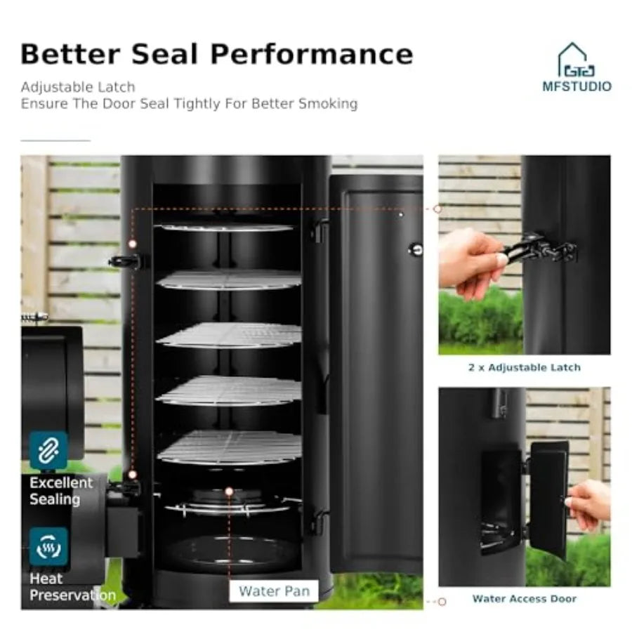 - You enjoy steady heat with a heavy-duty metal build, adjustable latches that seal the door to minimize heat and smoke loss, a cool-touch lid grip, and a water pan in the main chamber to keep meat juicy.