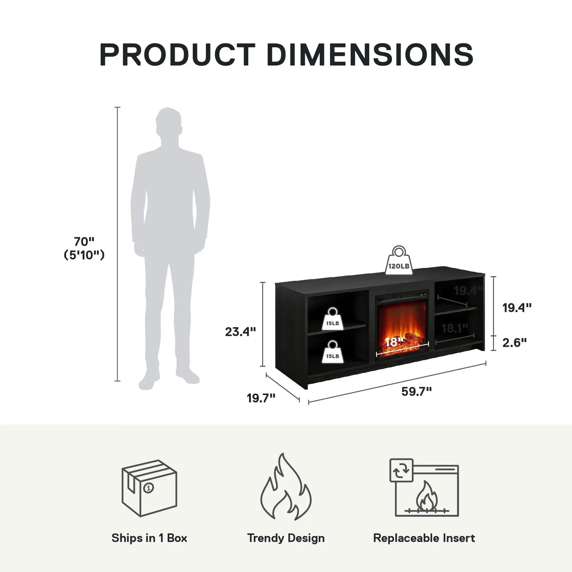 - Year‑round flame and heat: The 18" electric fireplace heater insert can be used with or without heat, warming rooms up to 400 sq ft; flames remain visible for ambiance via a standard 120V outlet.