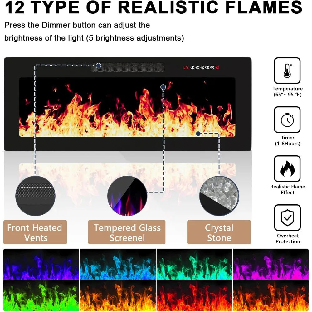 - 36" electric fireplace delivers an immersive 3D flame with 12 colors and 5 flame brightness/speed settings to customize ambiance and warmth.