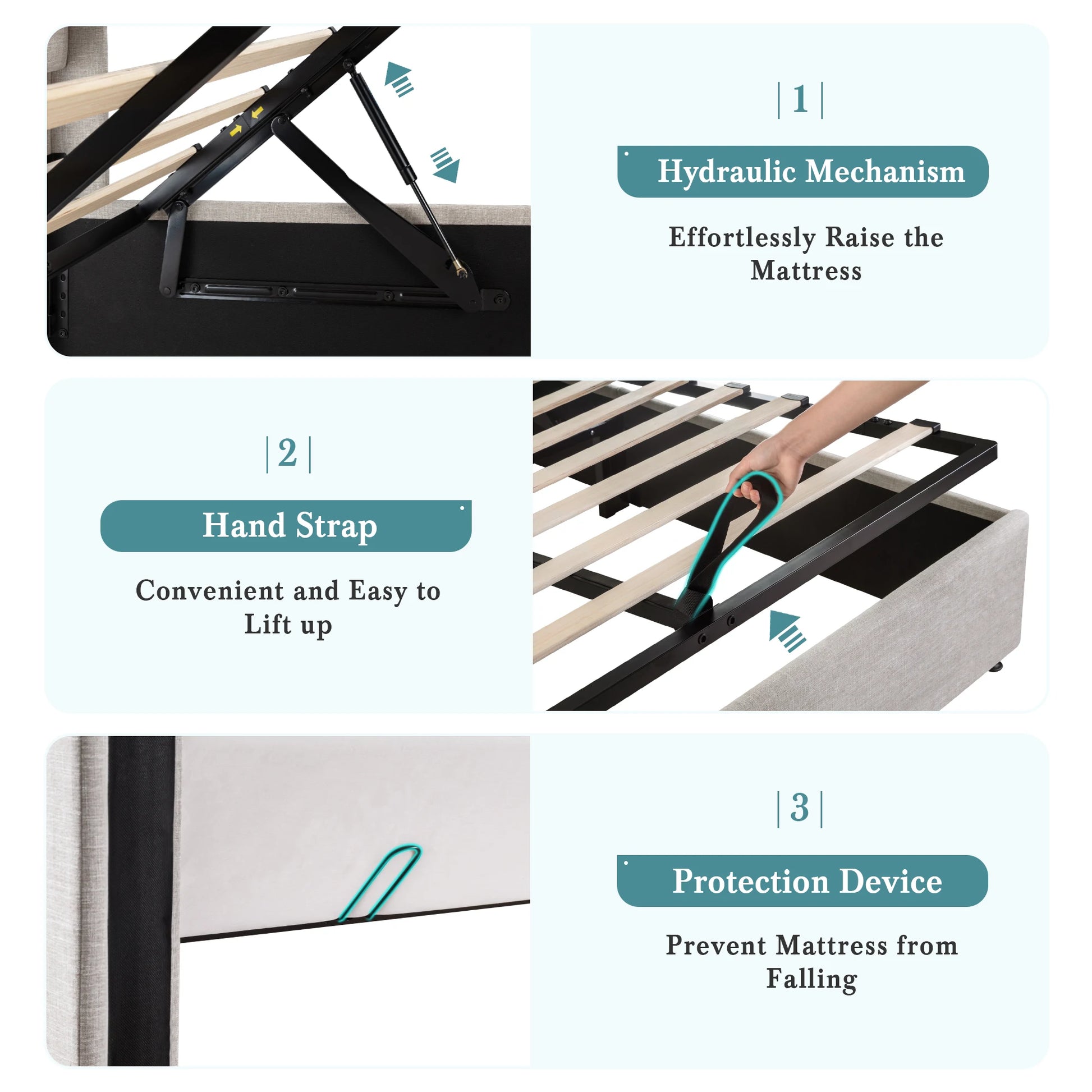 - Your space-saving hydraulic lift reveals a roomy under-bed compartment, ideal for bedding, seasonal wear, or extra linens.