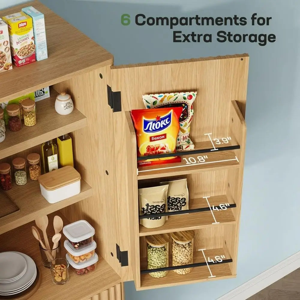 - Store a full pantry with 4 doors, 1 drawer, and two main compartments featuring six adjustable shelves plus six built‑in door shelves, so spices, drinks, and small accessories stay within arm’s reach.