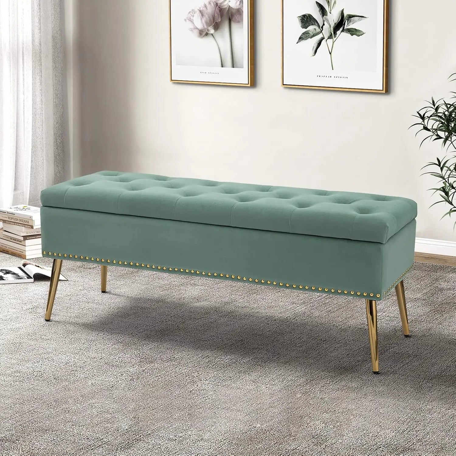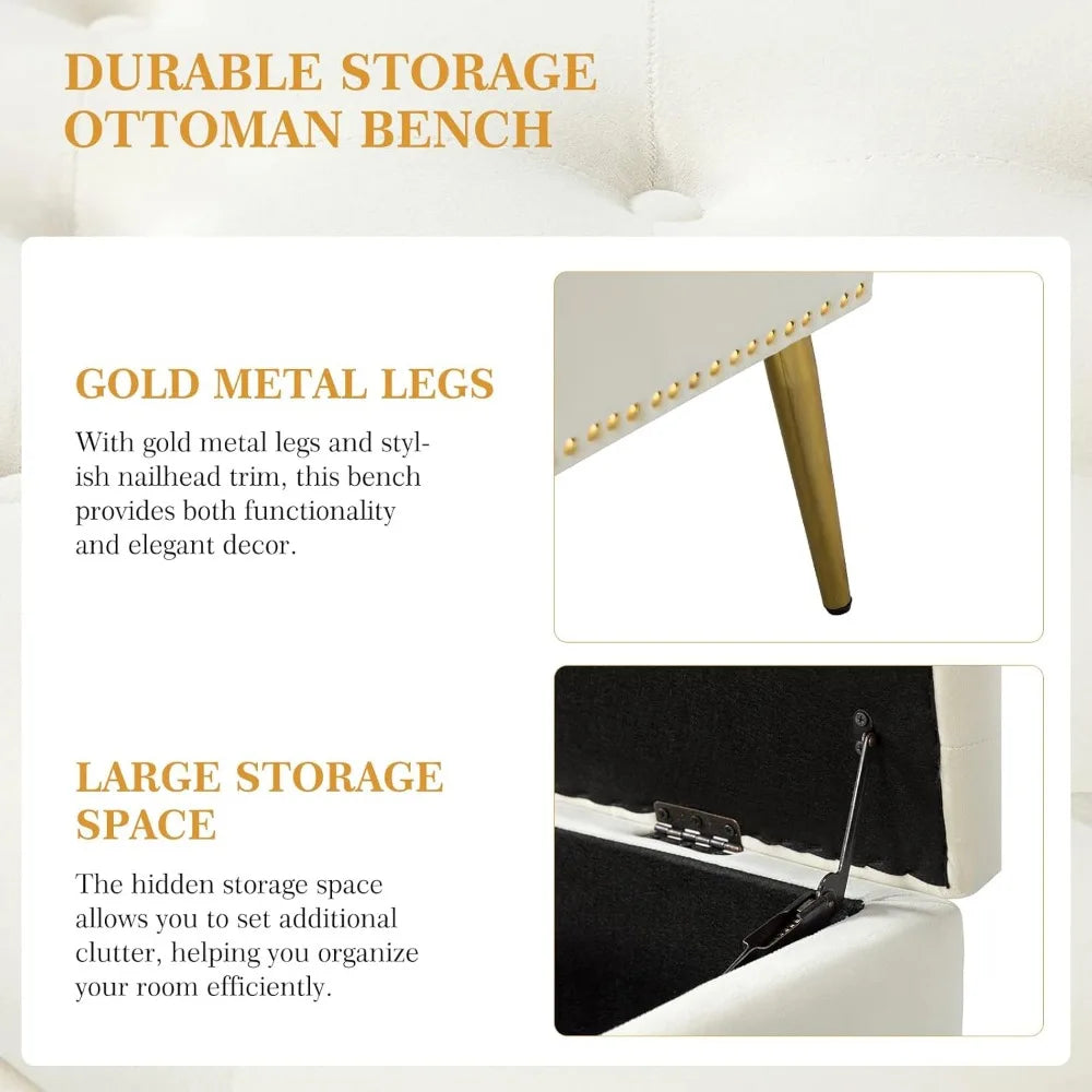 Velvet Storage Ottoman Bench With Base And Nailhead Trim