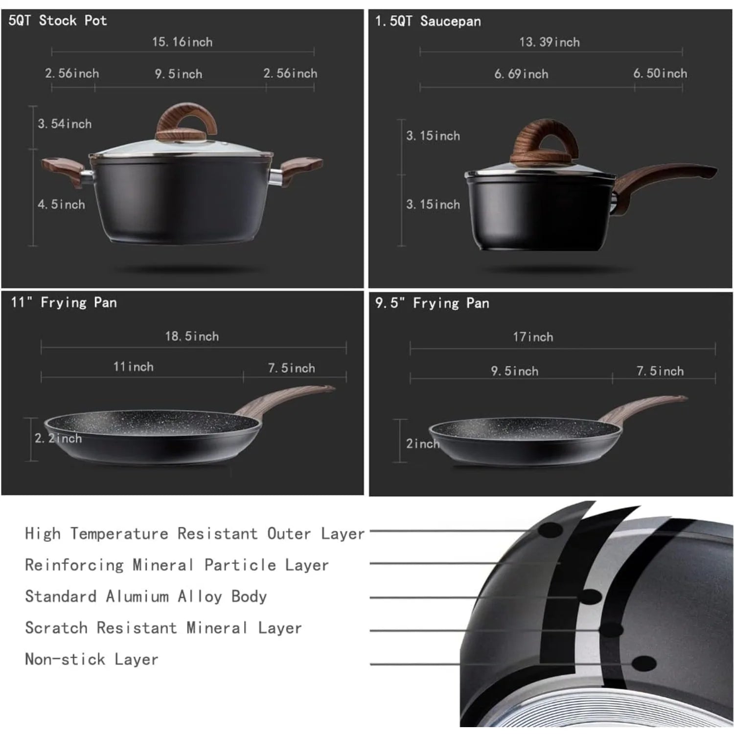 - A rivetless interior minimizes snagging and food buildup. This set includes 9.5" and 11" frying pans, a 1.5-quart saucepan with lid, and a 5-quart stockpot with lid.