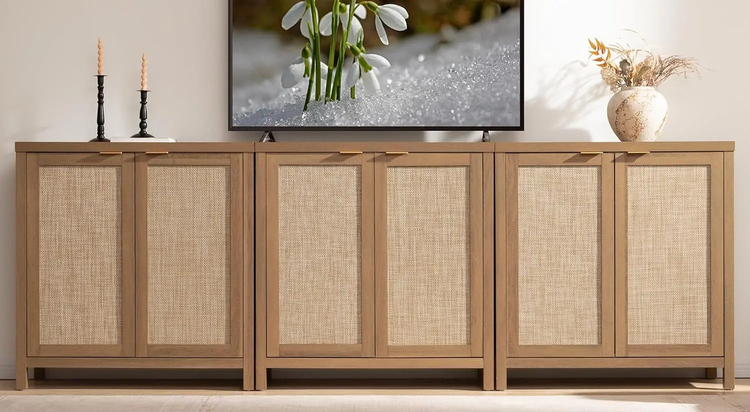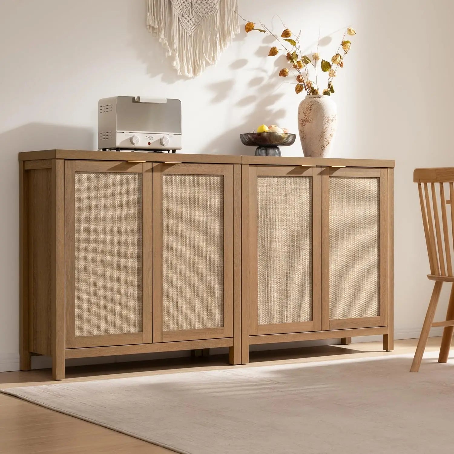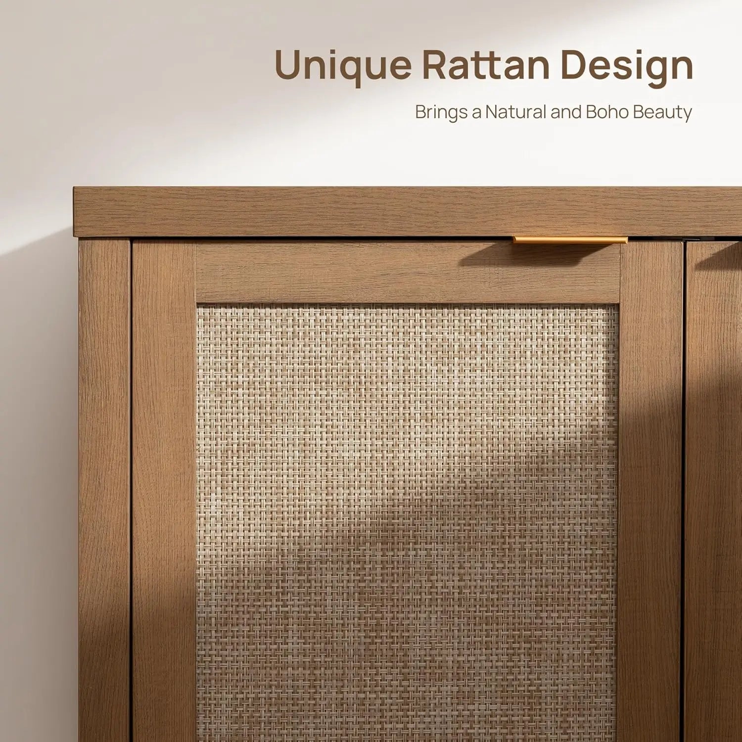 - Rattan-pattern doors (with durable plastic panels) add texture and warmth, while gold-tone handles provide a modern accent that complements diverse dining room styles.