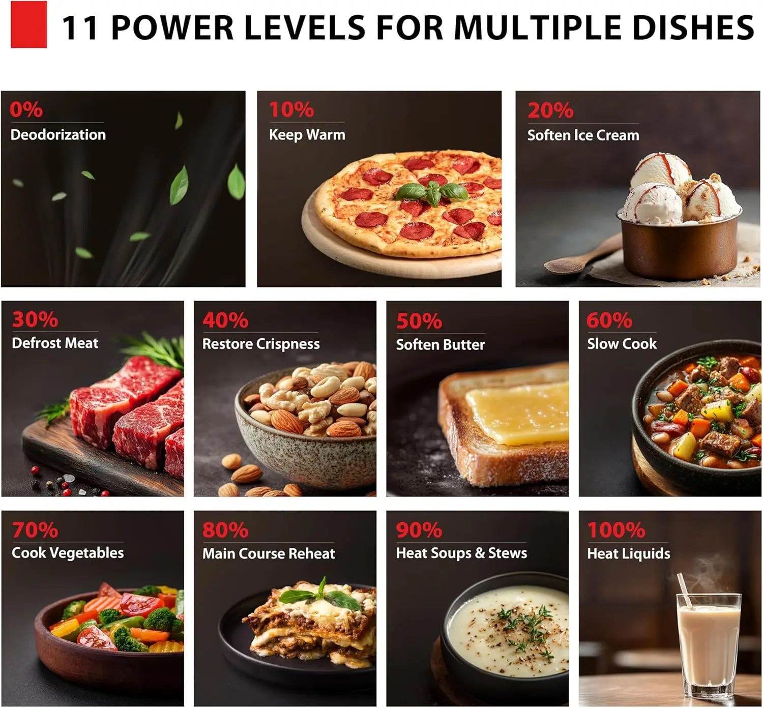- 900W of cooking power with 11 adjustable power levels, a 0.9 cu ft interior, and a 10.6-inch glass turntable to give you precise, even results.